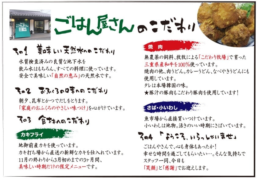 毎月の日曜以外の店休日はHP ごはん屋さん.comをご参照ください